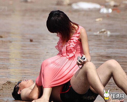 河边的小情侣很开心呀