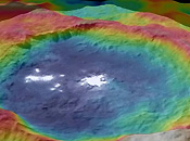 - 图为谷神星Occator陨坑彩色地形图。图像中蓝色代表最低的地形区域,而红色代表最高的地形区域,其余颜色为中间高度。这个陨坑非常特殊的地方就在于它是此前黎明号在谷神星上发现的神秘亮斑的所...